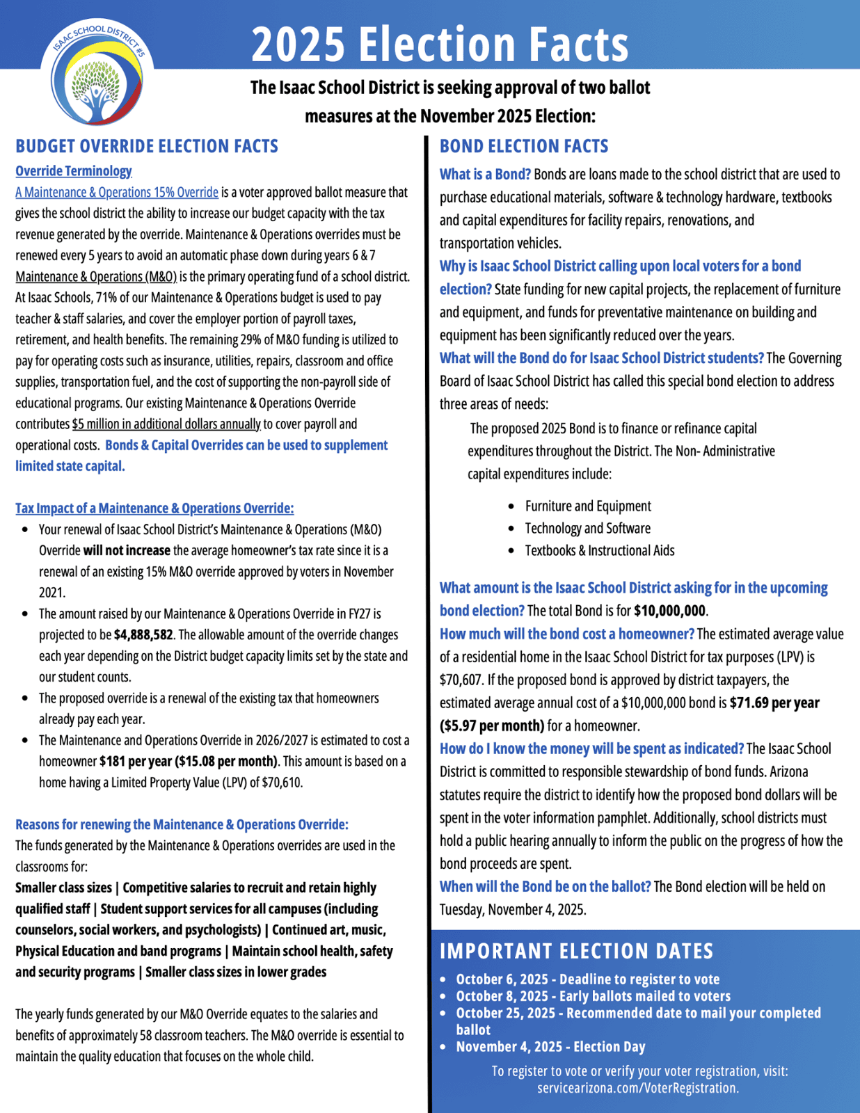 The Isaac Elementary School District is asking voters to renew its existing budget override and to approve a bond. Voting YES on both measures will provide a reliable resource of revenue to keep Isaac Schools open.